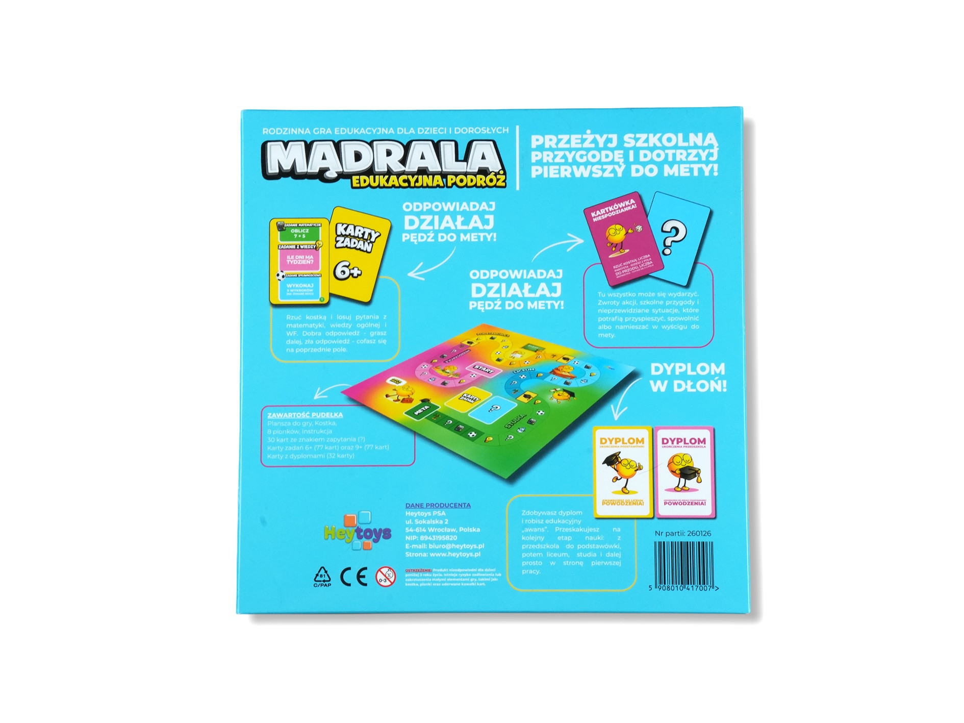 Mądrala to coś więcej niż gra planszowa - to pełna przygód historia, w której dziecko staje się bohaterem własnej edukacyjnej drogi. Każdy gracz rozpoczyna swoją podróż od pierwszych kroków w przedszkolu, by krok po kroku przechodzić przez kolejne etapy życia: przedszkolę, szkołę podstawową, liceum, studia, aż po osiągnięcie celu - ukończenia edukacji.