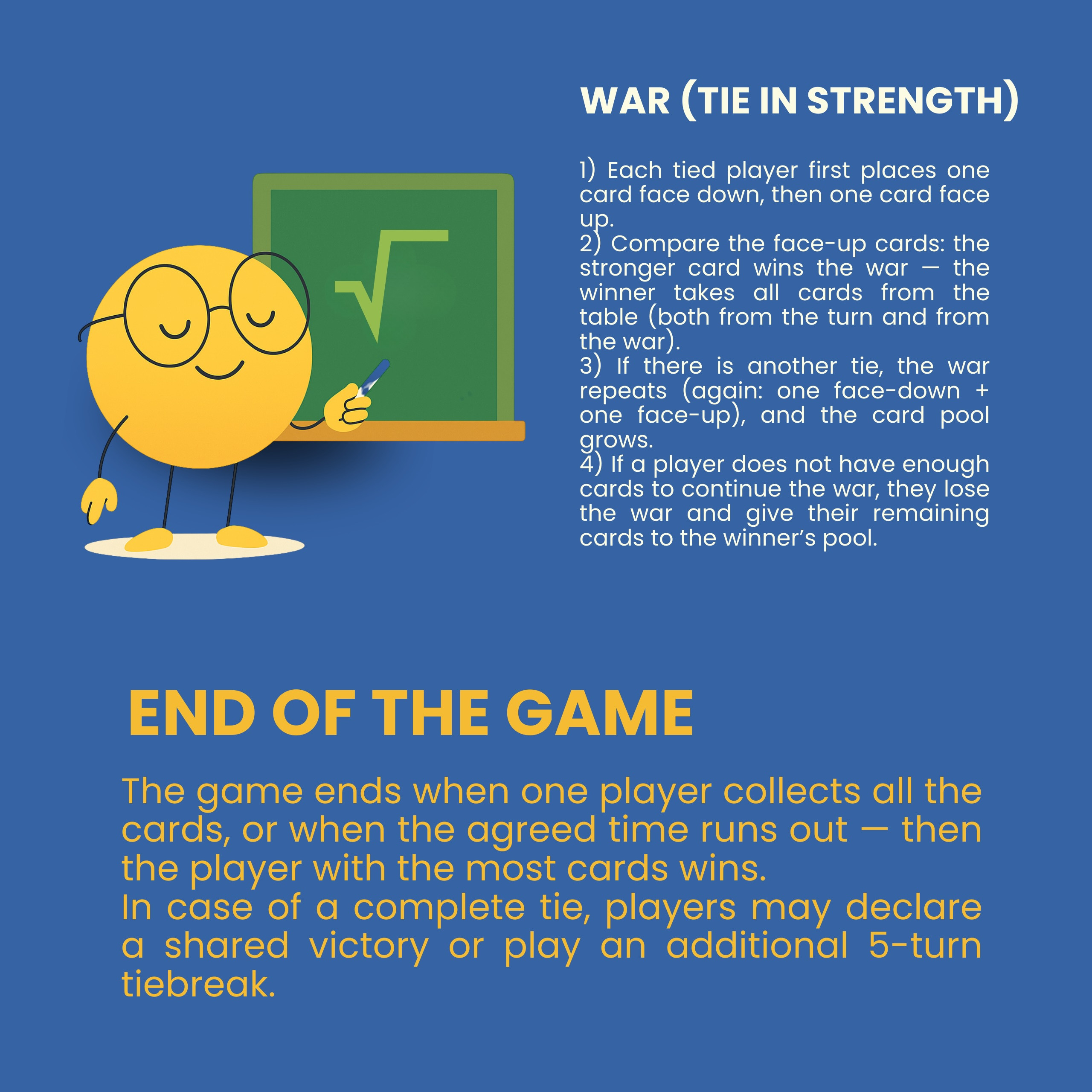 3 Remis mocy = wojna: jedna karta zakryta + jedna odkryta. Powtarzaj aż do rozstrzygnięcia.