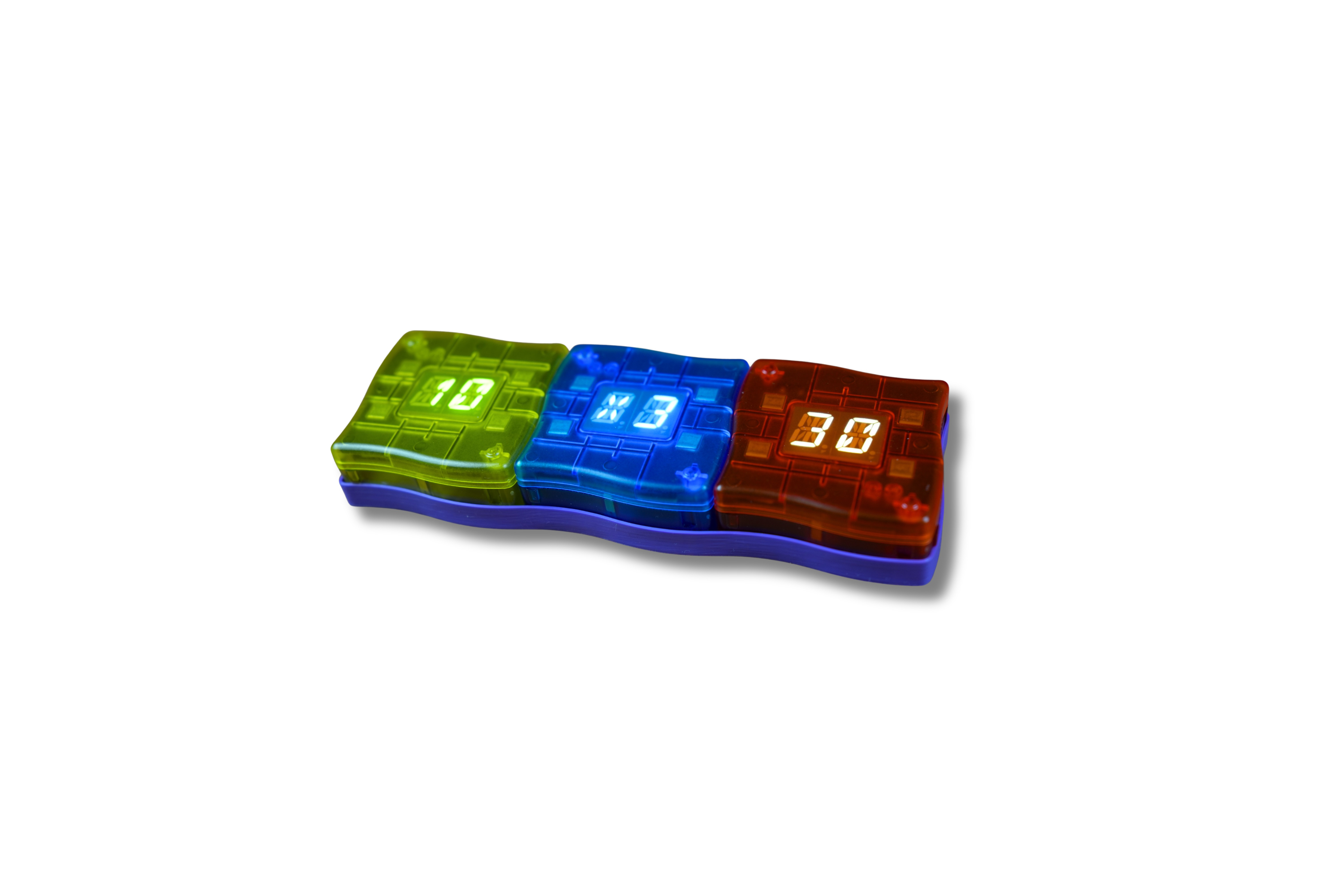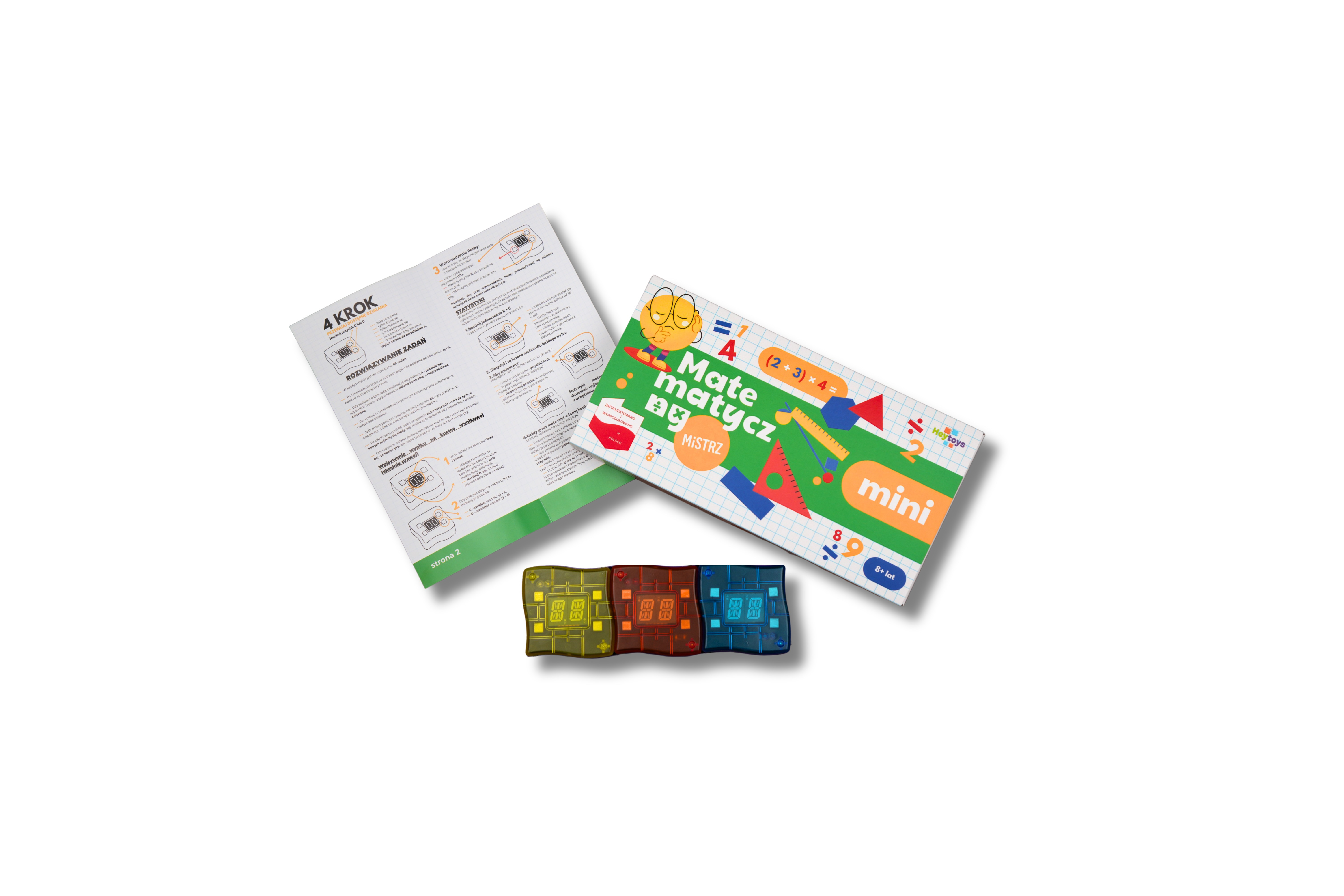 Matematyczny Mistrz Mini to interaktywna gra edukacyjna z trzema kostkami, które automatycznie generują działania matematyczne i sprawdzają odpowiedzi dziecka w czasie rzeczywistym. Wystarczy ułożyć kostki w linii, rozwiązać zadanie i wpisać wynik - urządzenie natychmiast pokaże, czy odpowiedź jest poprawna (zielone światło) lub błędna (czerwone).