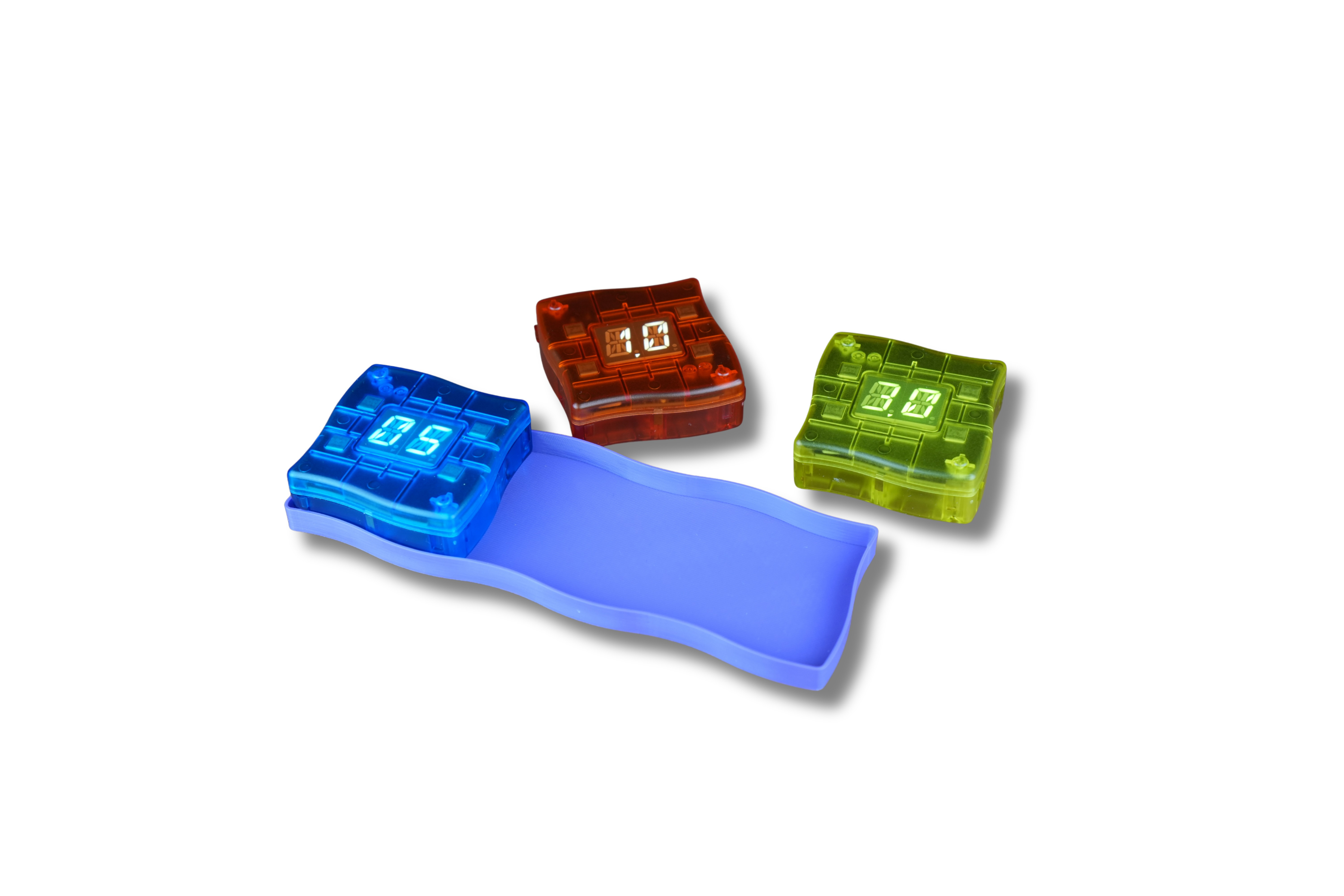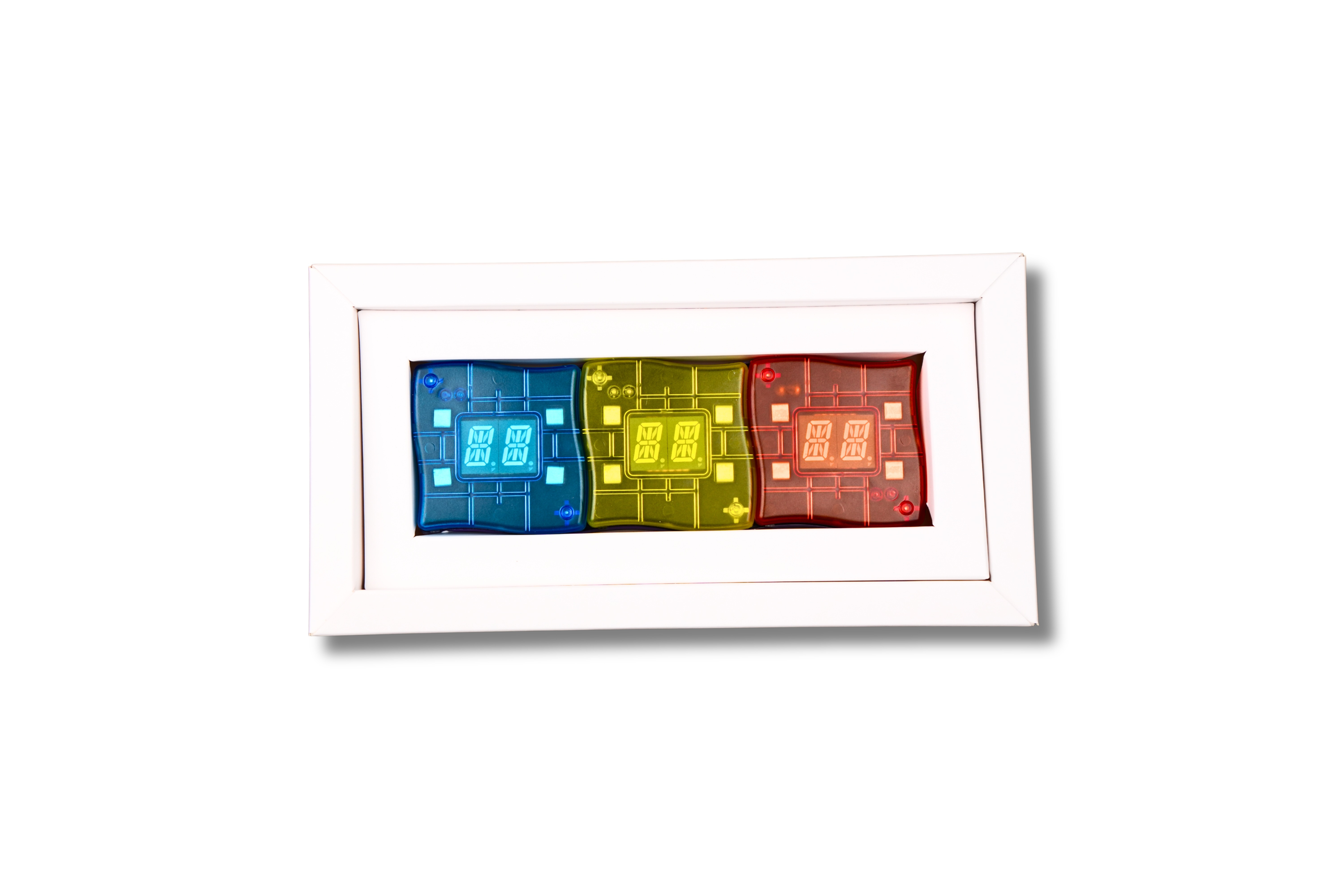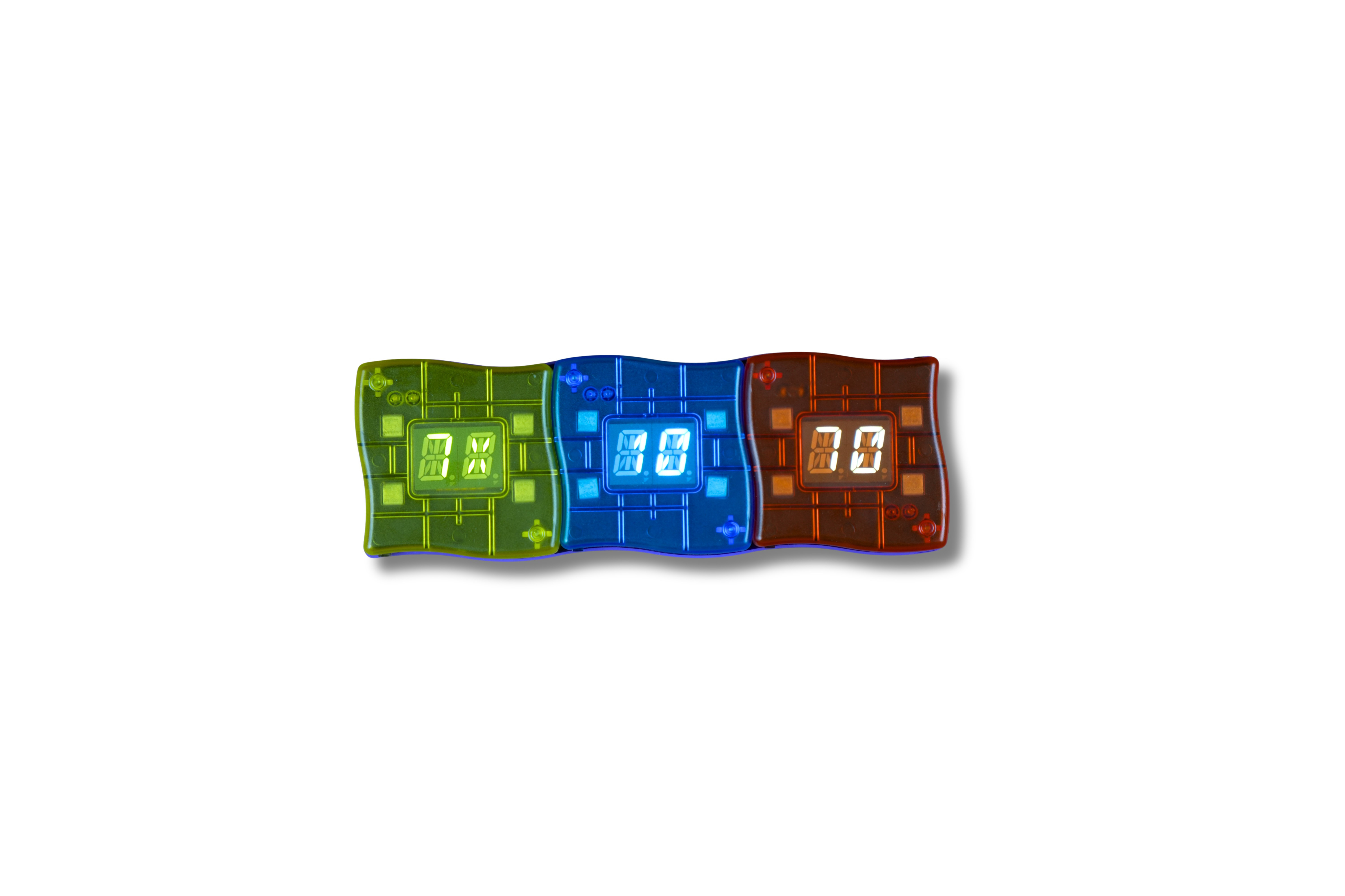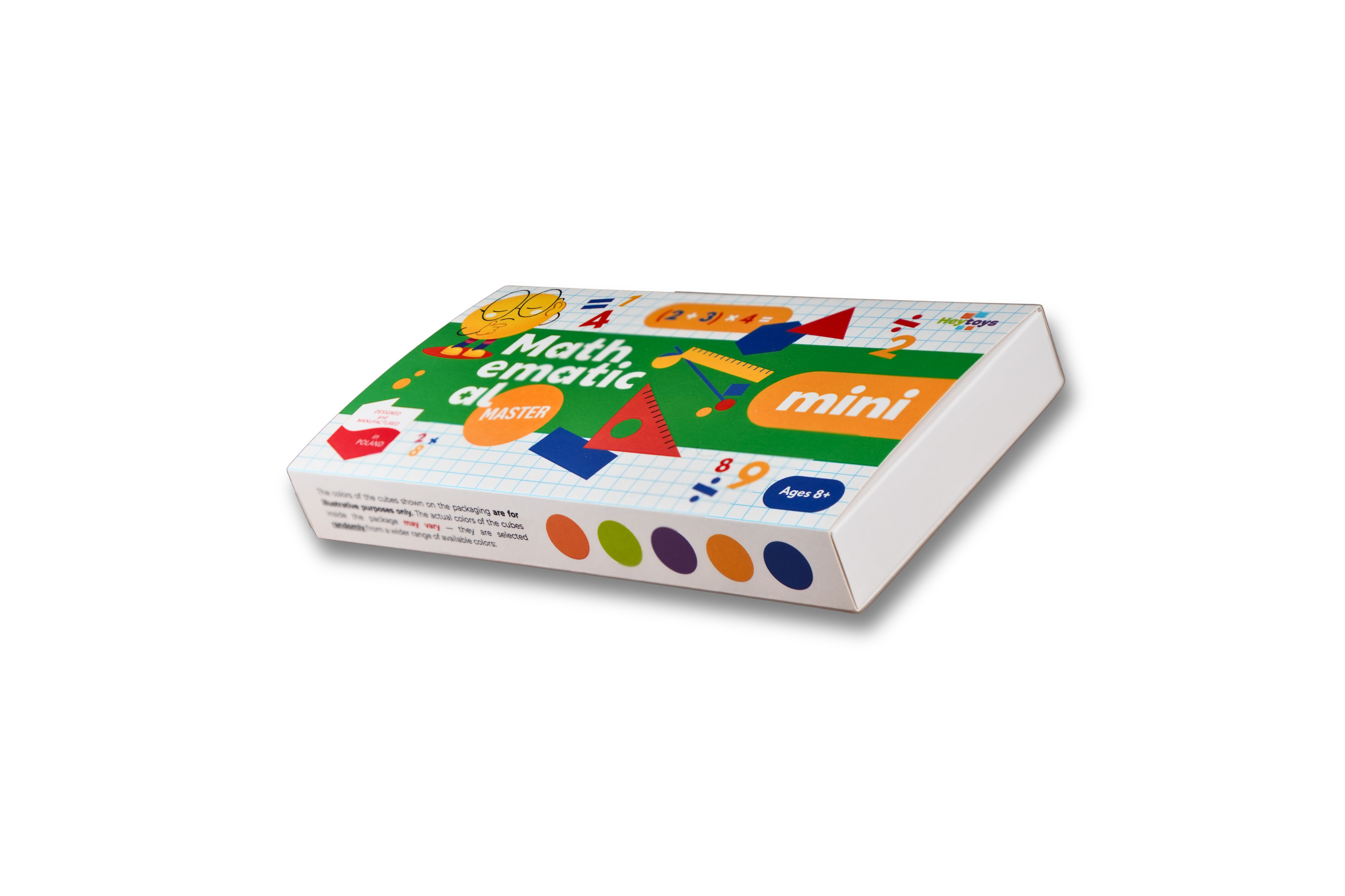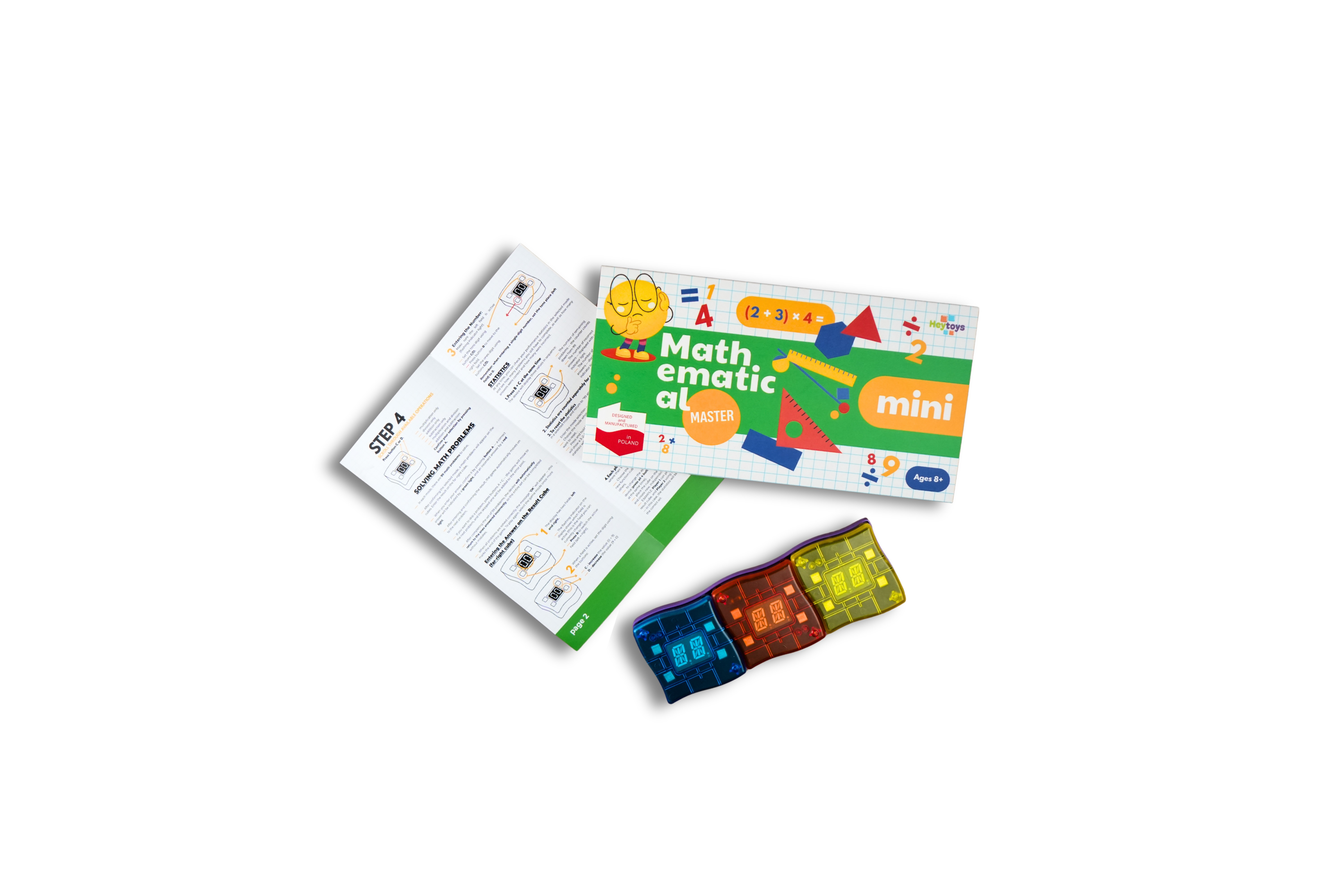 Matematyczny Mistrz Mini to interaktywna gra edukacyjna z trzema kostkami, które automatycznie generują działania matematyczne i sprawdzają odpowiedzi dziecka w czasie rzeczywistym. Wystarczy ułożyć kostki w linii, rozwiązać zadanie i wpisać wynik - urządzenie natychmiast pokaże, czy odpowiedź jest poprawna (zielone światło) lub błędna (czerwone).